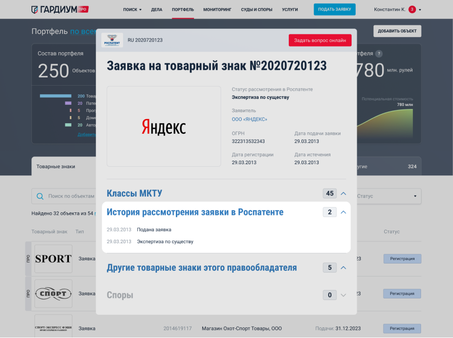 Еще одно требование к платформе — создать единую точку хранения IP-активов и отслеживать статусы по объектам, находящимся в процессе регистрации. «Гардиум.Про» решает и эту задачу. Портфель наполняется парой кликов: указывается ИНН или ОГРН правообладателя, а сервис автоматически собирает информацию о связанных объектах и отображает её в интерфейсе. Так как большинство IP-объектов Selectel зарегистрировано на одно юридическое лицо, это не заняло много времени.