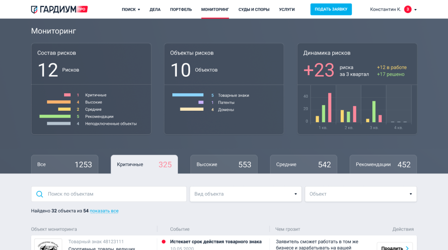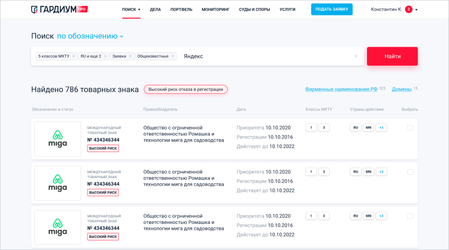 «Гардиум.Про» автоматизирует выявление рисков с помощью мониторинга. В этом разделе объединены три кита средств индивидуализации: товарные знаки, фирменные наименования и домены. При этом сервис с помощью AI-алгоритмов умеет определять виды деятельности каждого из объектов и сопоставлять их с классами МКТУ. Степень схожести объектов с учетом пересечений по видам деятельности используется при ранжировании рисков и уменьшает ложные срабатывания.