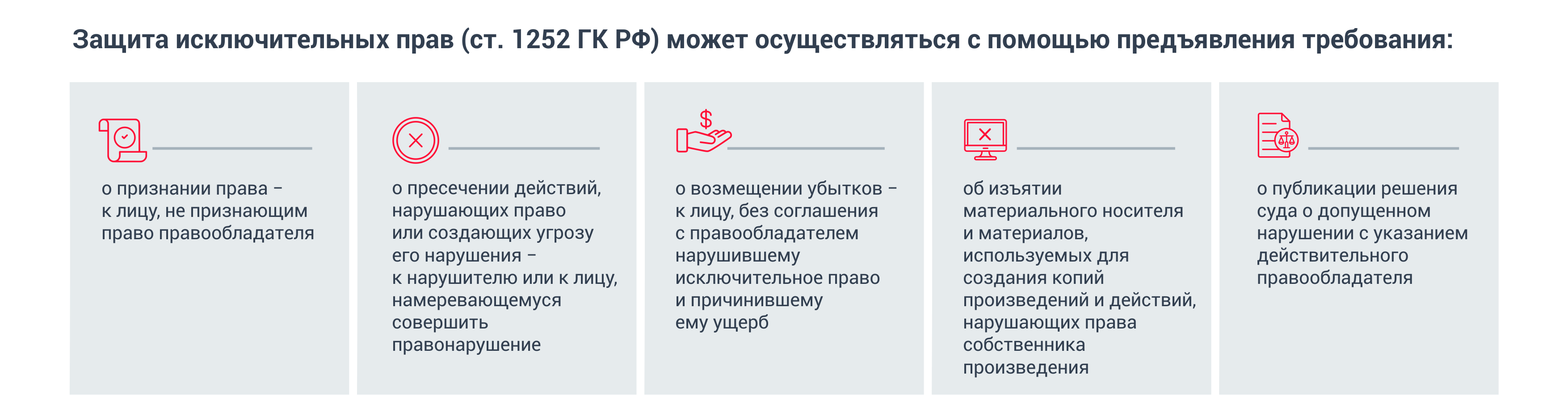 Защита исключительных прав (ст. 1252 ГК РФ) может осуществляться с помощью предъявления требования:
