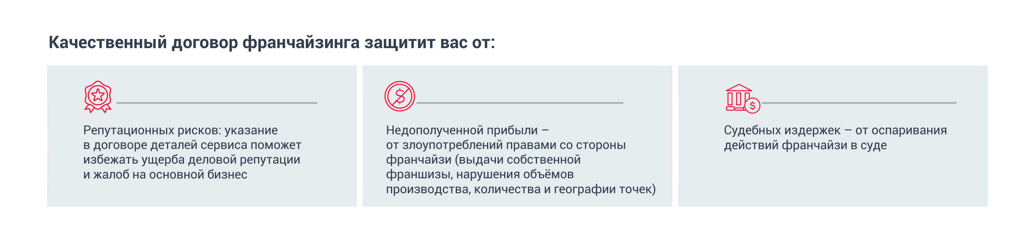 Благодаря такому проектному подходу мы помогаем запускать сделки по франшизе в максимально быстрые сроки и гарантируем своим клиентам надежную защиту от нарушений прав на уровне договора.