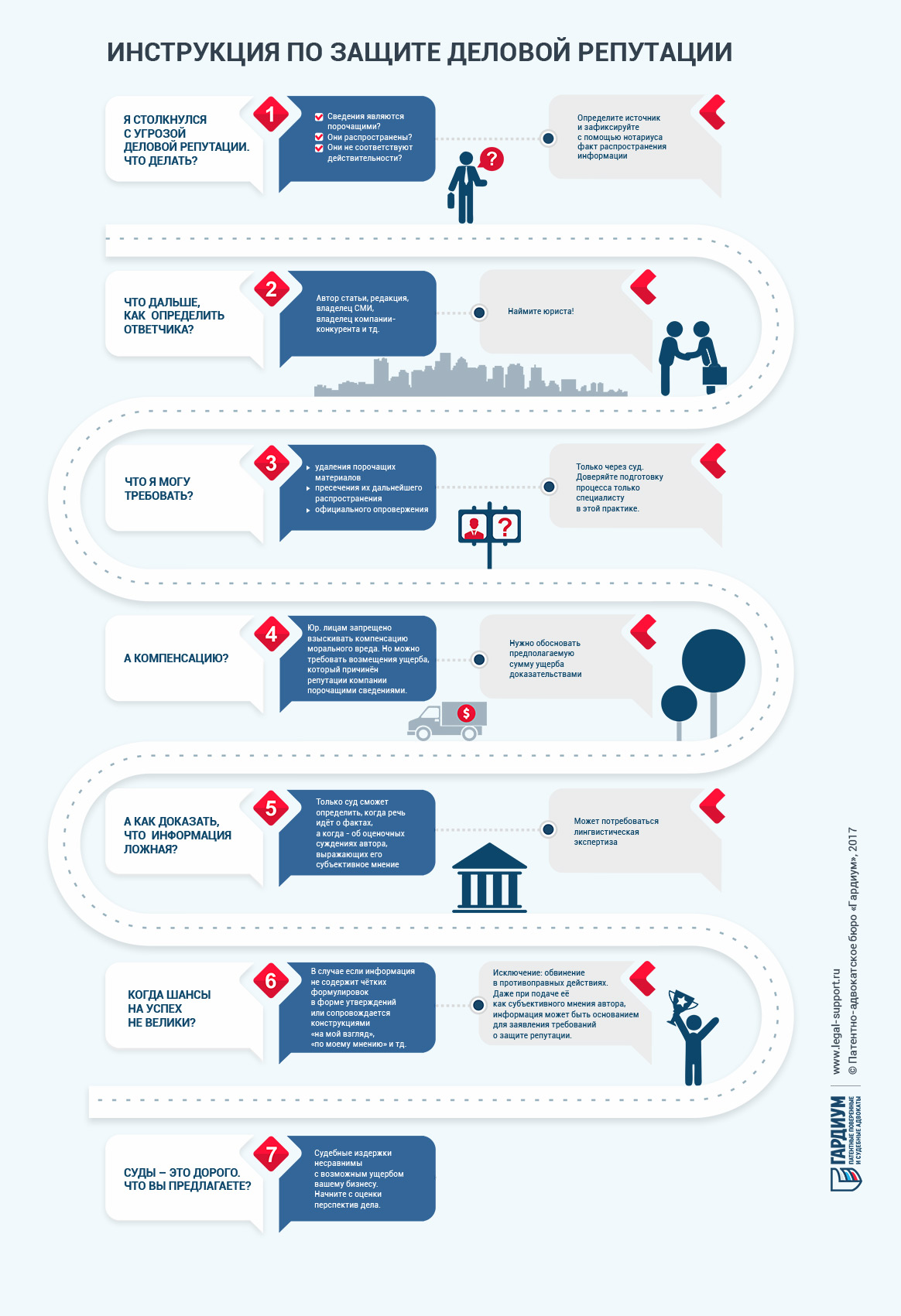 Специалисты Патентно-адвокатского Бюро «Гардиум» имеют опыт защиты чести, достоинства и деловой репутации в суде, в том числе взыскания компенсации, и готовы представлять Ваши интересы на любой стадии спора.