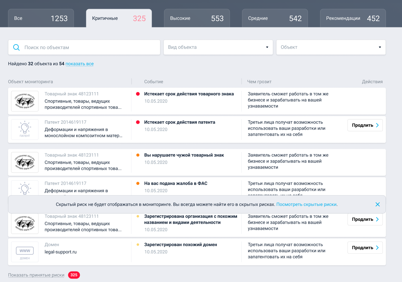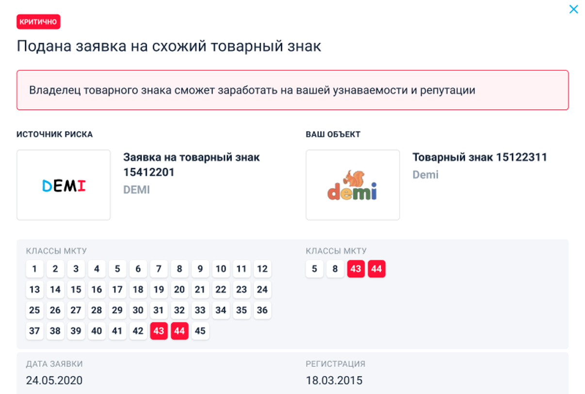 1. Мониторить нарушения. Система предупредит, если кто-то откроет компанию с похожим наименованием, подаст заявку на сходный товарный знак или зарегистрирует похожий домен. Алгоритмы сканируют интернет и при появлении нарушителей направляют правообладателю уведомление с указанием степени риска. Клиент вовремя узнает о критическом нарушении, подготовит претензию и защитит свой бизнес от конкурентов.