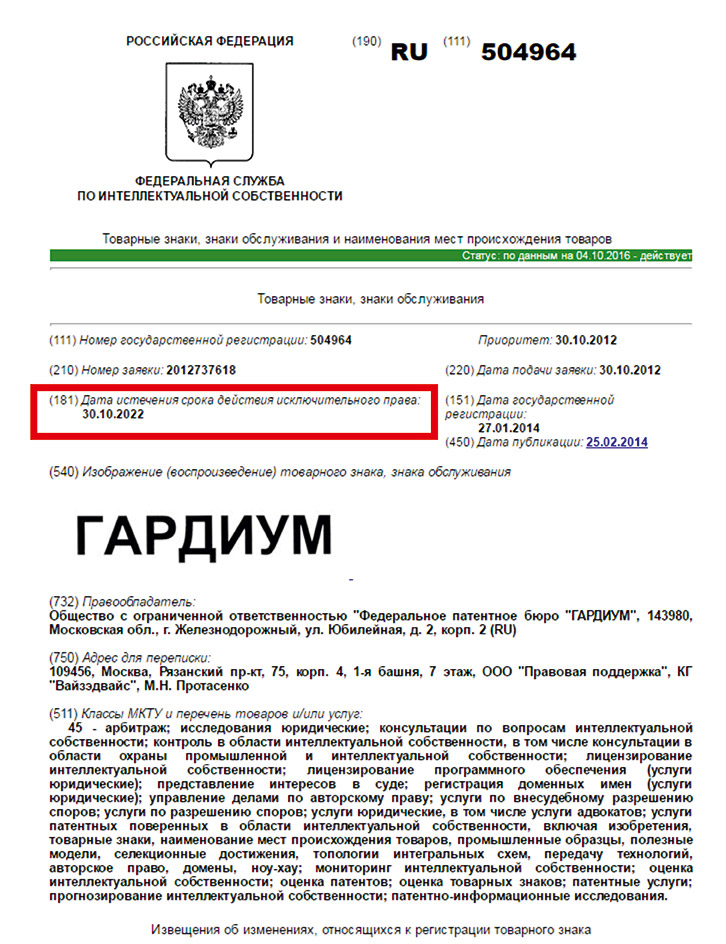 Срок действия товарного знака составляет 10 лет с даты подачи в Федеральный институт промышленной собственности заявки на регистрацию. Обратите внимание, что данный срок начинает течь именно с момента подачи документов, а не с даты выдачи свидетельства.