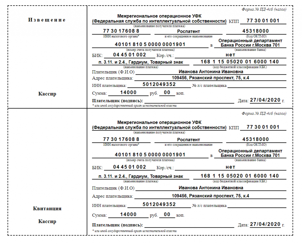 Также в квитанции необходимо указать действия Роспатента, за которые уплачиваются пошлины, и название регистрируемого обозначения или номер заявки, если пошлины уплачиваются позже. Действия Роспатента - это номера пунктов Положения о патентных пошлинах, которые оплачиваются.