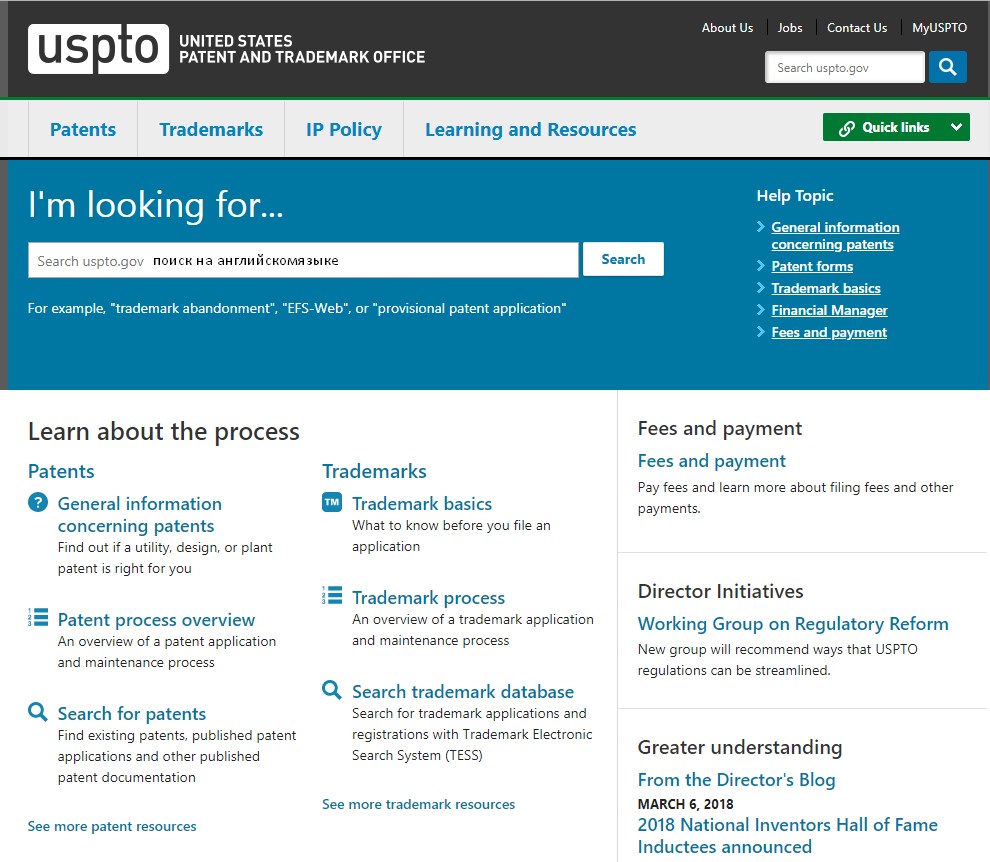 Для начала загрузите страницу https://www.uspto.gov/. Теперь предстоит самое интересное — <br>1. На сайте вам предложат 2 варианта поиска — по патентной базе и по сайту. Выбираем первый вариант и переходим на страницу http://www.uspto.gov/patft/index.html.
