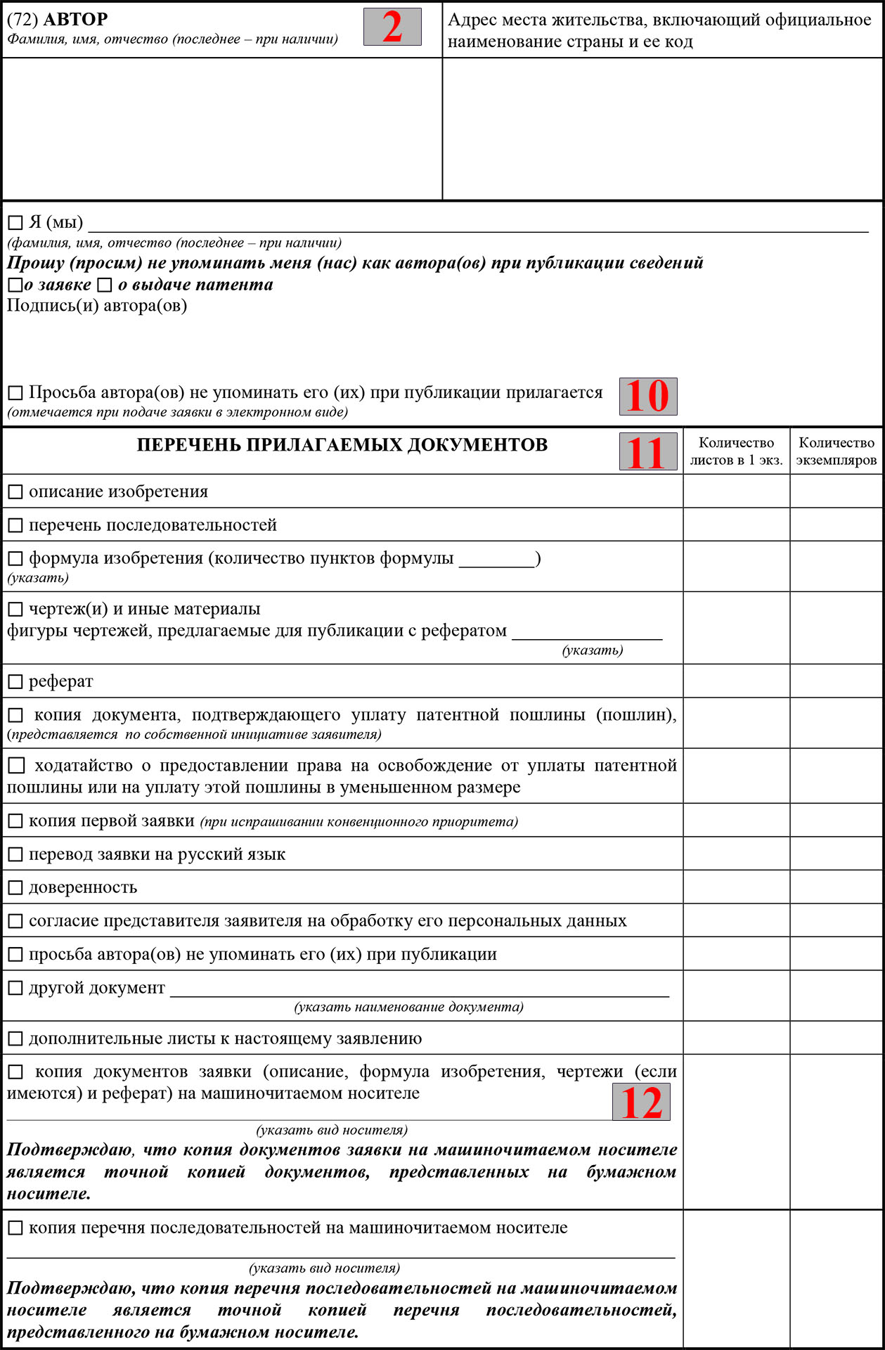 - Учтите, что не всегда автор изобретения желает разглашать о себе информацию. Если это так, то поставьте галочку в соответствующей клетке и заверьте подписью автора (10).