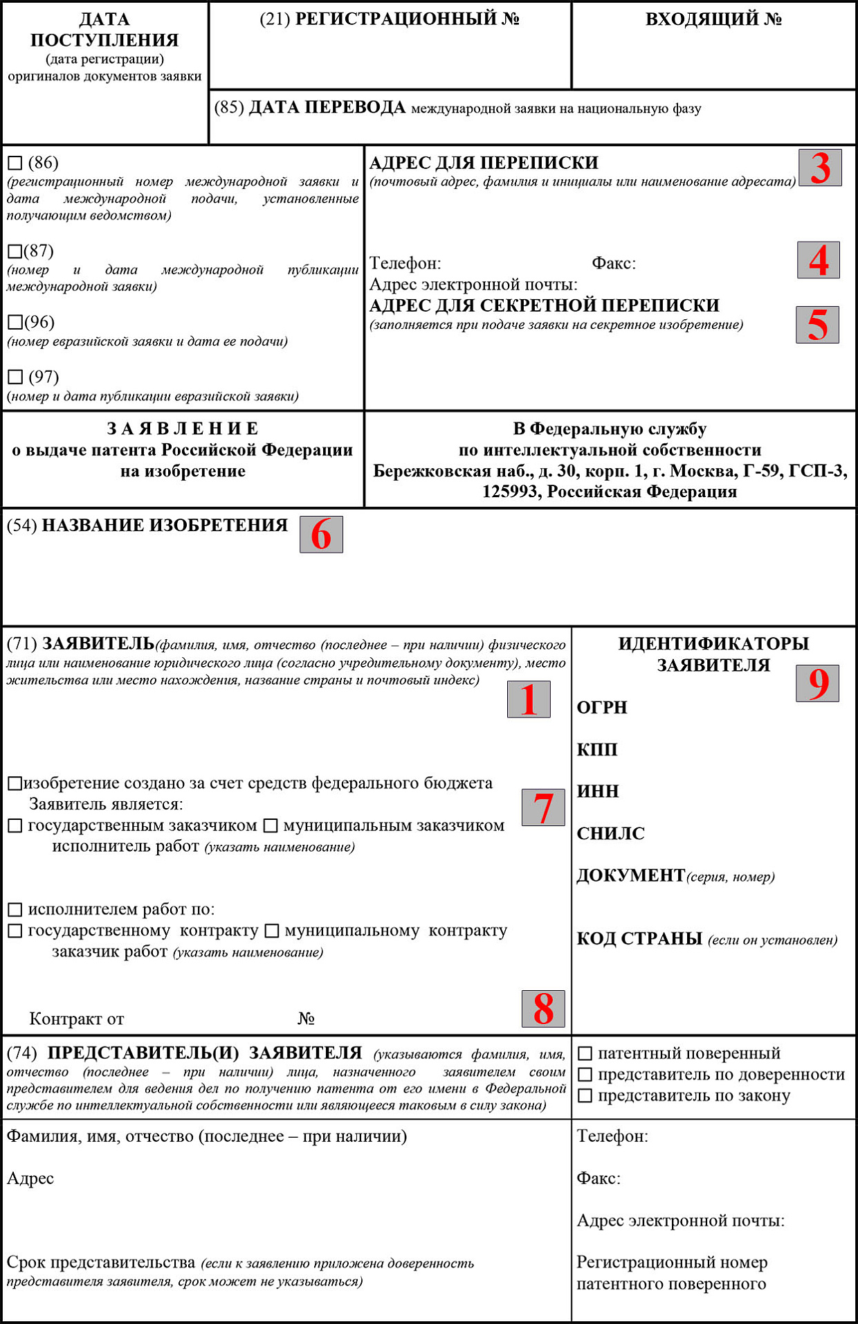 - Учтите, что если изобретение относится к секретной разработке, потребуется указать в заявке адрес для секретной переписки (5).