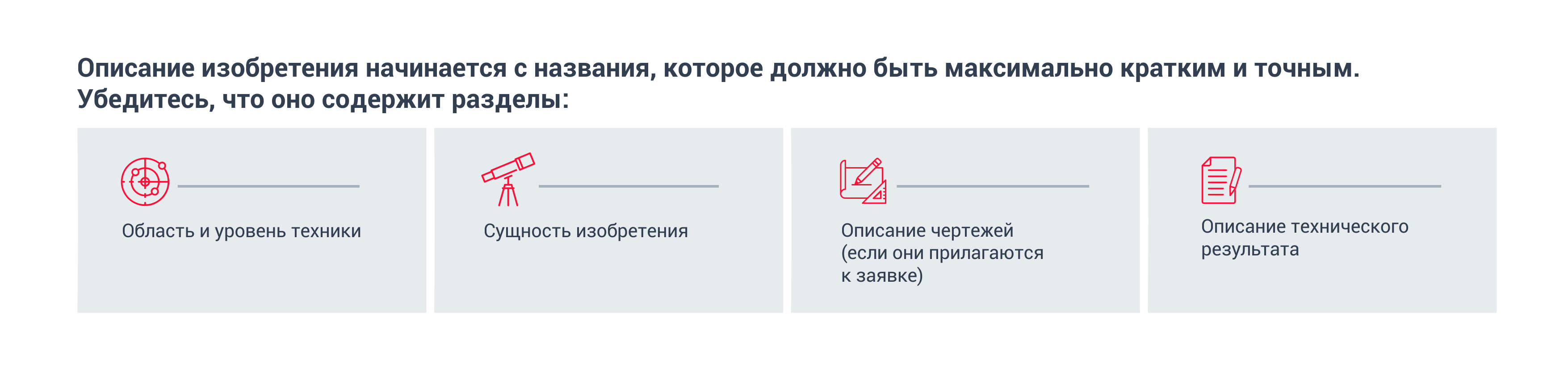 Описание изобретения начинается с названия, которое должно быть максимально кратким и точным. Убедитесь, что оно содержит разделы: