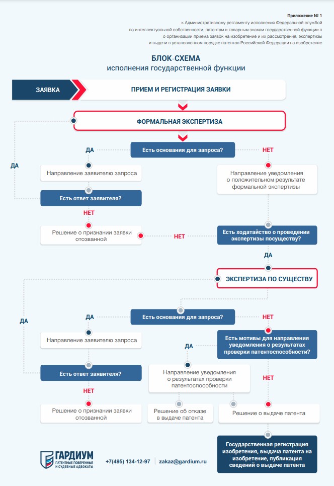 Схема получения патента на изобретение (Блок-схема исполнения государственных функций). Скачайте файл в формате PDF.