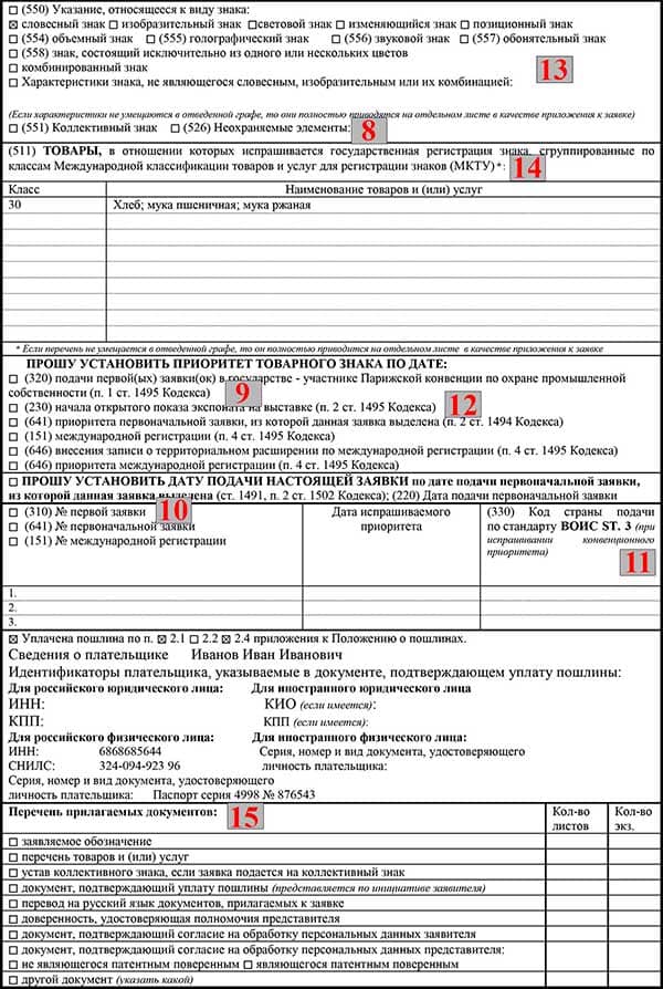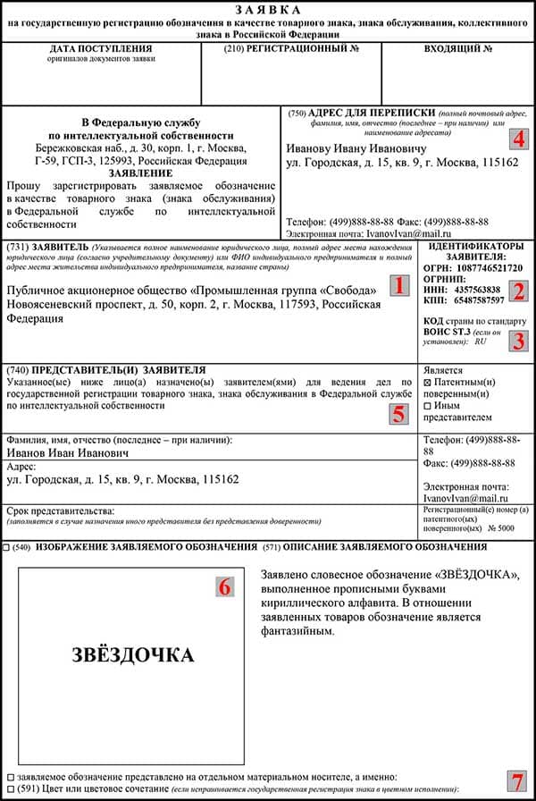 Образец заполнения заявки на регистрацию товарного знака