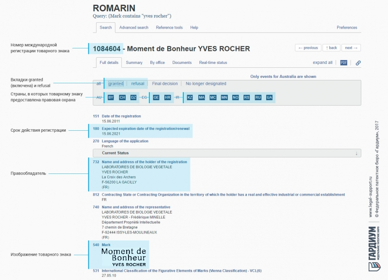 В карточке будет указан правообладатель, до какого момента действует регистрация, а также на какие страны она распространяется. Кроме того, кликнув на вкладки Granted и Refusal, можно посмотреть в каких странах товарному знаку была предоставлена правовая охрана, а в каких в ней было отказано.