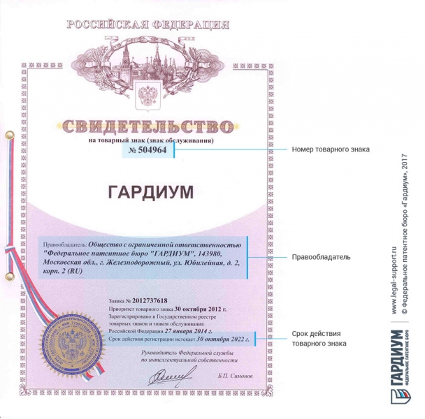Каждому правообладателю выдается свидетельство о регистрации его товарного знака. Оно подтверждает тот факт, что данному товарному знаку предоставляется правовая охрана на территории РФ. В свидетельстве содержится информация о номере регистрации, правообладателе товарного знака и сроке его действия.