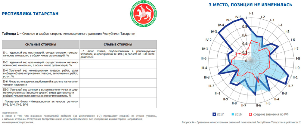 В рейтинге инновационной активности регионов России по итогам 2017 года, представленном Ассоциацией инновационных регионов России, к слабым сторонам республики отнесен единственный критерий – число статей, опубликованных в рецензируемых журналах, индексируемых в РИНЦ в расчете 100 исследователей. При этом по всем остальным позициям значения превышают средние показатели по стране. Региону присвоено третье место.