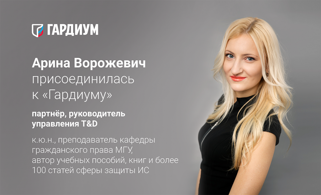 Партнёром «Гардиума» и руководителем управления T&D (training and development) стала Арина Ворожевич – известный эксперт и автор многочисленных материалов в области интеллектуальной собственности.